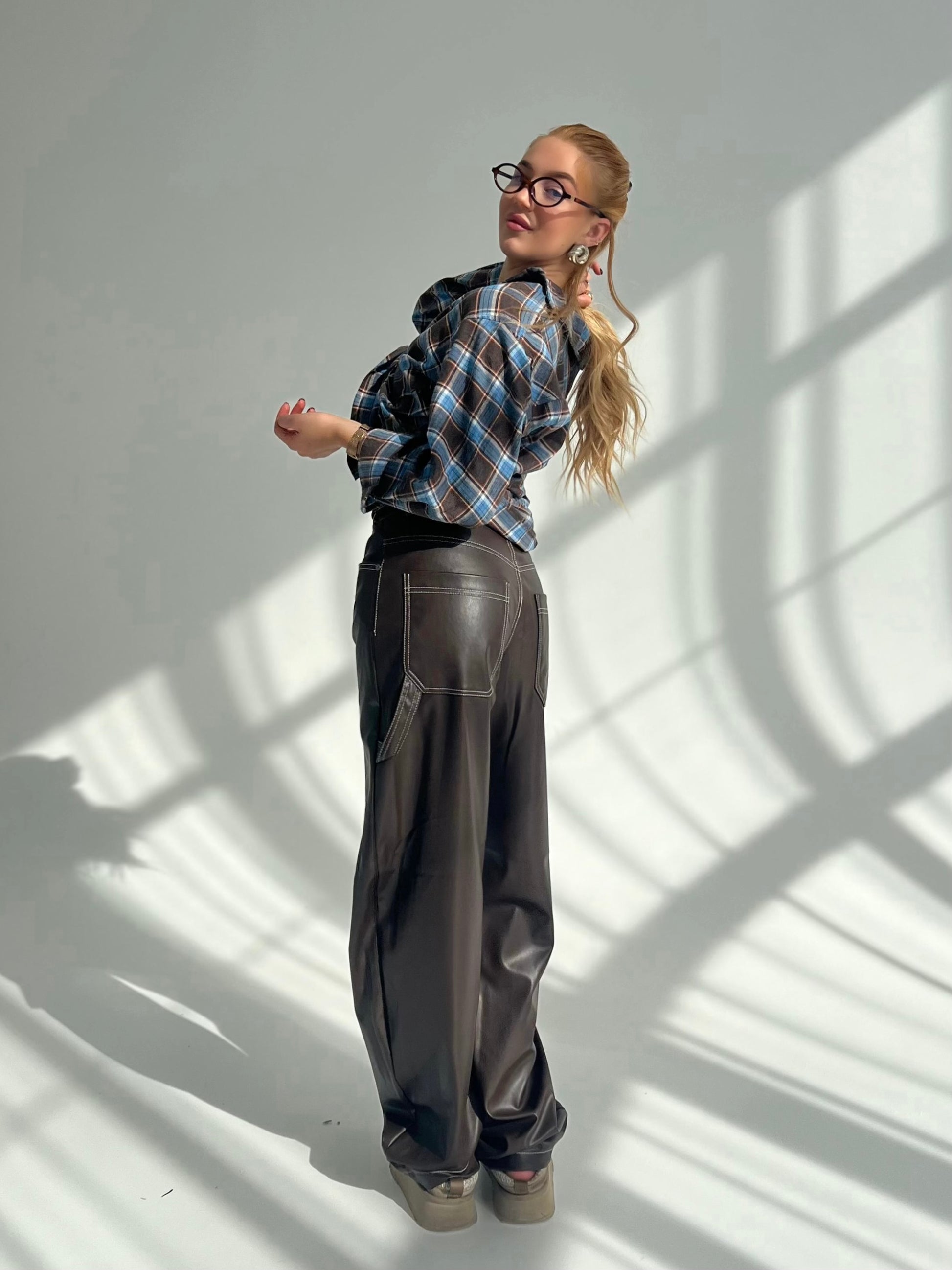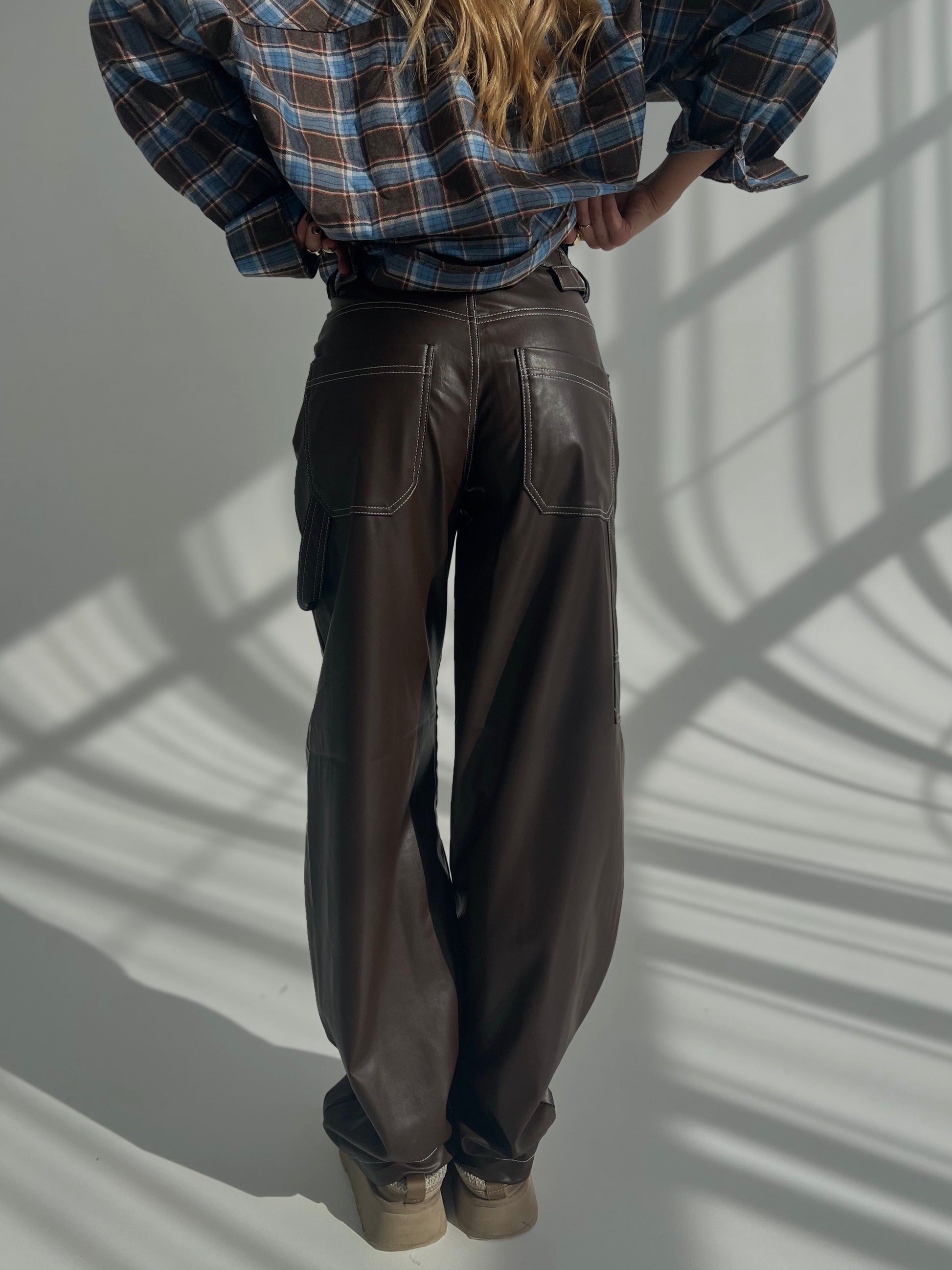 Eco ādas brīvi krītošas bikses tumši brūnā krāsā ar stilīgām detaļām.
